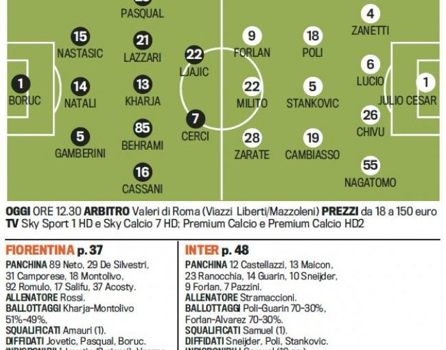 Troliga laguppställningen: Fiorentina-Inter