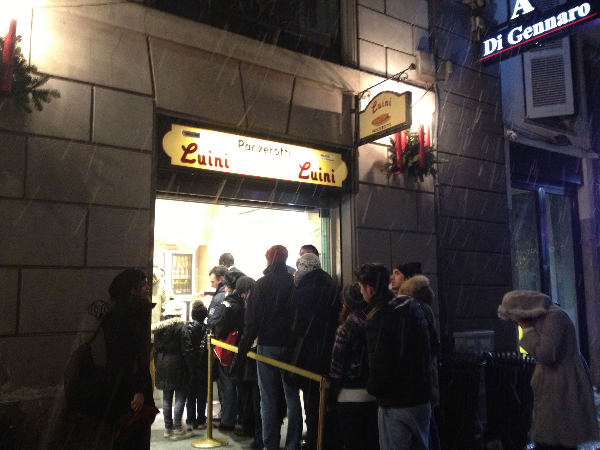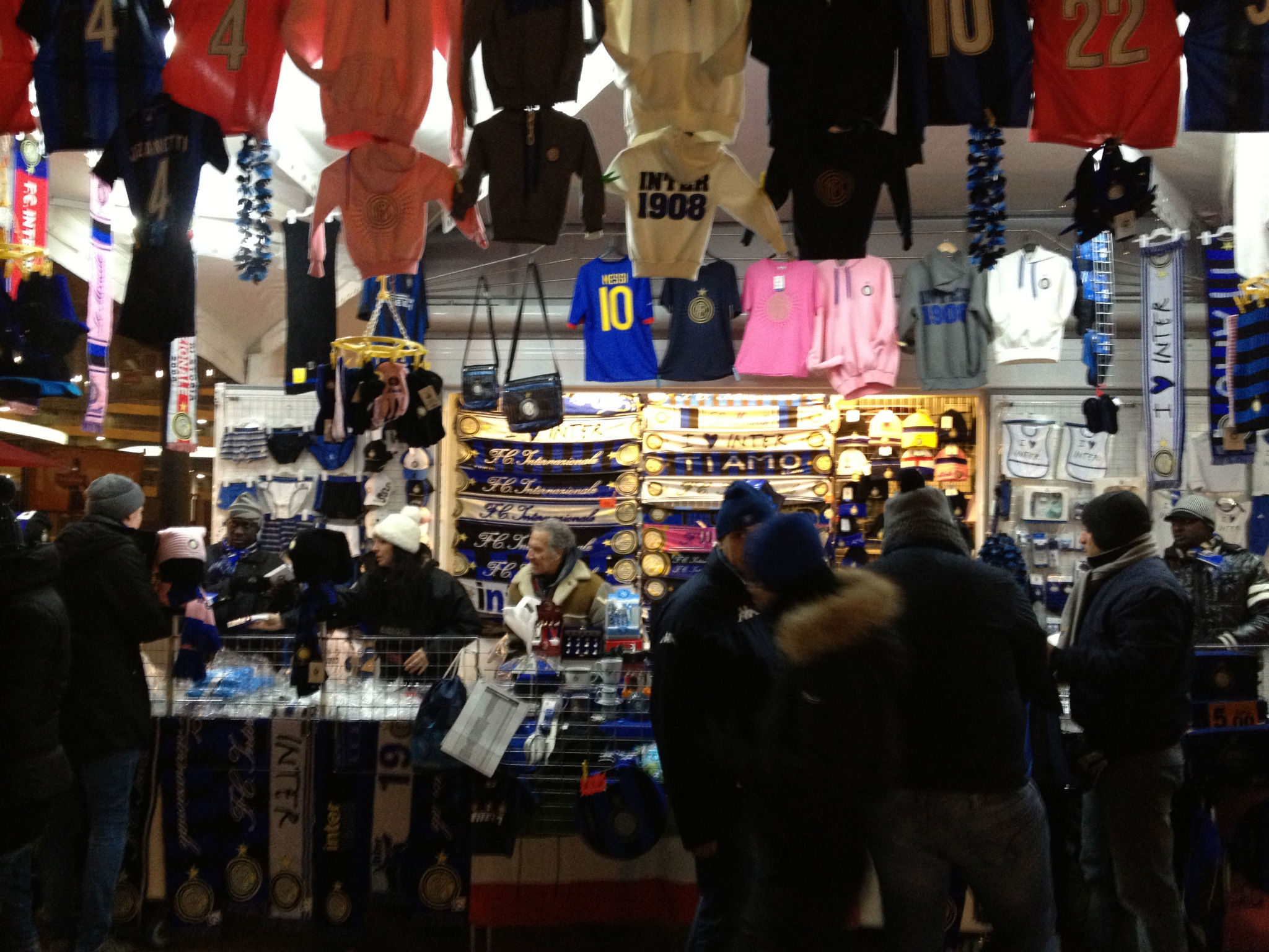Vi startade med att köpa lite rostade kastanjer som visade sig vara en delikatess. Färden gick vidare till Inters högkvarter där vi radade upp oss för ett gruppfoto. Folk som passerade kom upprörda fram till oss och frågade om vi demonstrerade för att Sneijder hade lämnat. Sedan tog vi oss till en av resans höjdpunkter och det var Intershopen. Där inne fanns bilder från Inters historia och det var både roligt och intressant att få se. Jag köpte en Inter mössa och en Inter tröja med Cassano på ryggen men det var ett svårt val, det stod mellan Zanetti, Guarin och Cassano. Ett stort tack till Nima som lät mig få låna hans medlemskort så jag fick min rabatt då jag inte hade hunnit få mitt egna kort. Efter besöket i Intershopen så tog vi oss till ett känt ställe, kallat Panzerotti Luini där vi avnjöt en underbar Panzerotto. Detta är ett av Milanos populäraste matställe där äter det allt från rika kvinnor med pälskappor till vanliga ungdomar och det var en fantastisk matupplevelse.