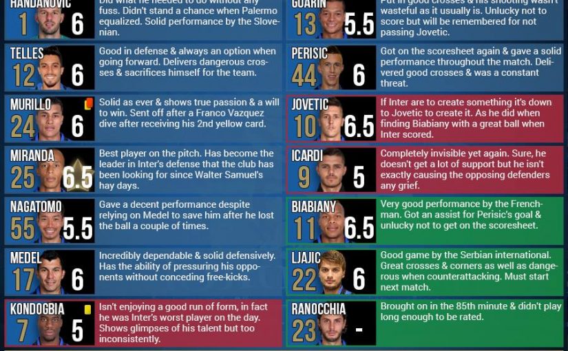 Samir Handanovic – 6: Did what he needed to do without any fuss. Didn’t stand a chance when Palermo equalized. Solid performance by the Slovenian.