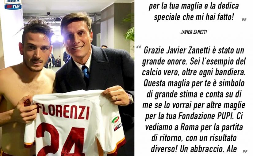 As most are aware of Inter vice president Javier Zanetti is very involved in charity work and has a foundation called PUPI that he started with his wife Paula. Roma’s Alessandro Florenzi gave his shirt to Zanetti to be auctioned out by the foundation after the game with a special dedication on his Facebook page: