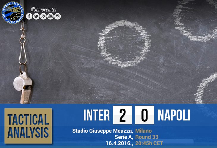 Roberto Mancini seems like he has finally made his mind regarding his team’s formation choosing once again a 4-2-3-1/4-4-2 shape. Samir Handanovic was under the posts, behind a defensive line that consisted of Nagatomo, D’Ambrosio, Miranda and Murillo. Kondogbia and Medel protected the defense, creating a double pivot while Perisic and Brozovic played as the wingers. Up front, Icardi was always trying to take advantage of Napoli’s high defensive line and possible mistakes with their offside traps, while having Jovetic behind him to connect.