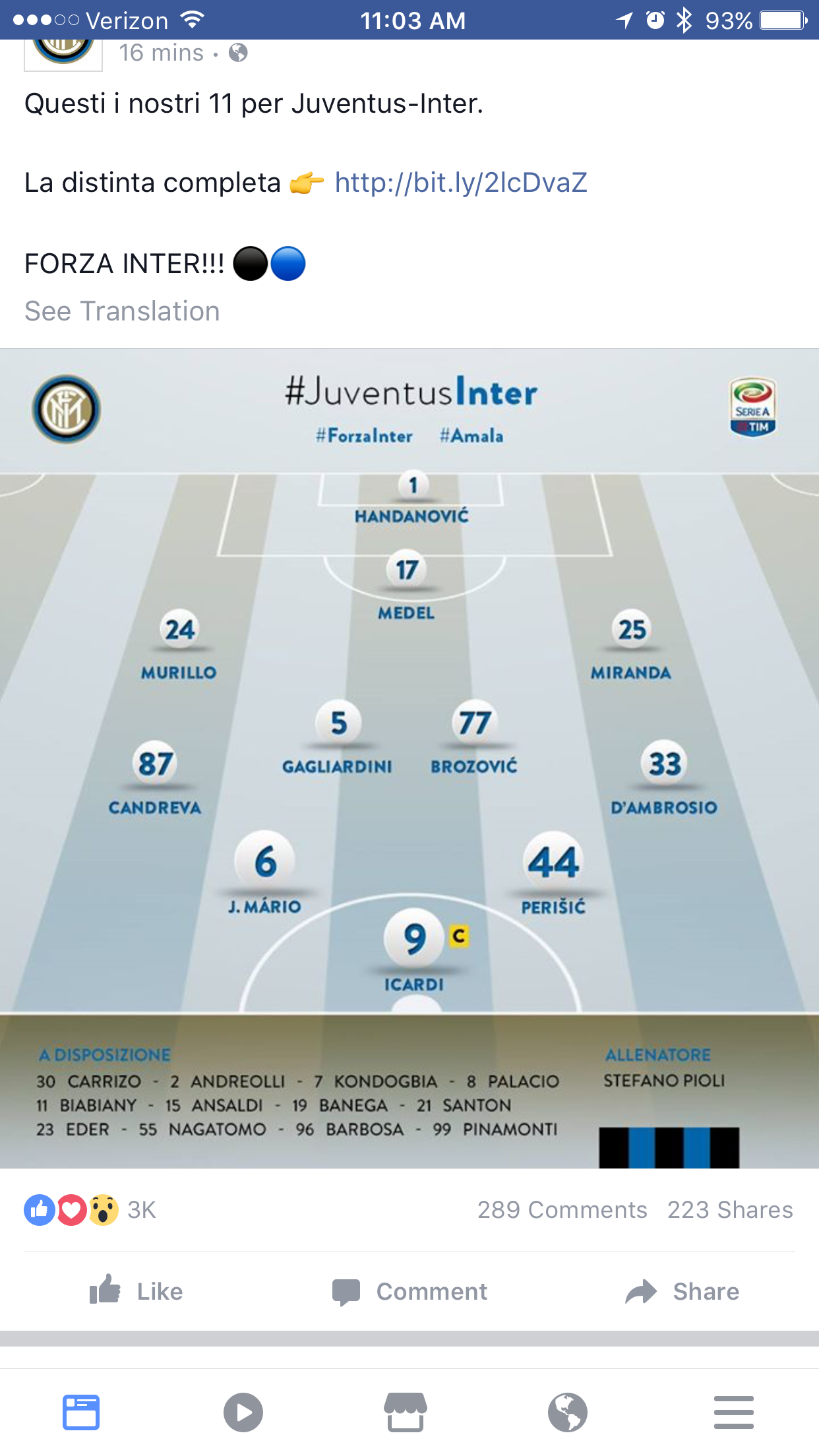 Stefano Pioli has decided to go for a 3-man defence woth D’Ambrosio and Candreva as wingbacks as well as opting for Brozovic to join Gagliardini in the middle of the pitch. Up front Icardi is flanked by Joao Mario and Ivan Perisic.
