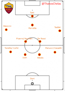 The first and most obvious thing that someone notices of course is the lack of a real striker up front, but the presence of Totti as a “false nine” that was moving continuously between the lines and dropping towards the ball with intention to drag CBs and open up spaces for the atypical “number 10” of that team, Simone Perrotta, to run into.