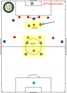 The combination of the above two factors until now has meant that Inter plays with a lot patience in the construction of the game trying to find open passing lanes through the CBs and DMs towards the area in front of the opposition d-line in order to, firstly create numerical advantages against the opposition DM with the “number 10” and one of the wingers that comes towards the center and then as a result of that find Icardi with a pass close to or inside the opponent’s area.