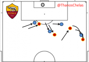 The new game-style was based on De Rossi’s and Paredes’(who had a secondary role) ability to make one-touch long balls with accuracy, Dzeko’s ability to receive them with his back on goal and keep the opponents behind him if needed and Nainggolan’s ability to move upwards quickly to receive the ball from Dzeko between the lines or to move in one of the spaces created in the opponent’s defensive line.
