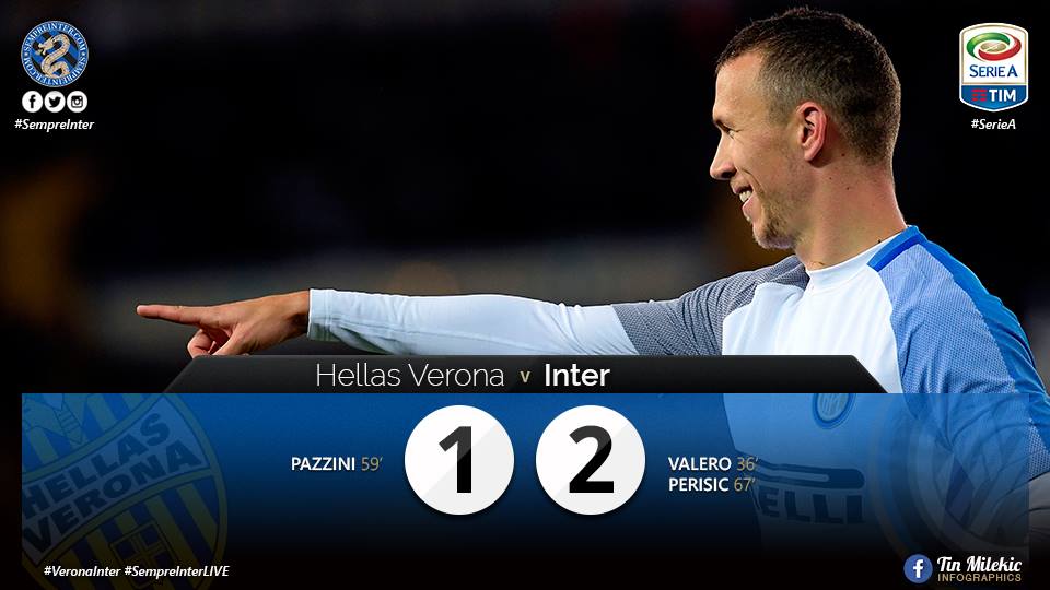 Inter set a new club record by recording their 9th win in their first 11 matches in the Serie A after Borja Valero scored his first ever goal in an Inter shirt and Ivan Perisic hammered home his 4th goal of the season after former Nerazzurri striker Giampaolo Pazzini equalized from the penalty spot.
