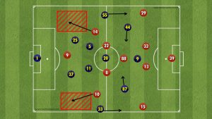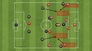Inter’s shape when attacking in the first half was also very clever and intriguing. The two full backs were instructed to cut inside when Inter had the ball instead of trying to overlap and the wingers stuck to the byline. This confused the Torino defence and took advantadge of the natural laziness of the Torino wingers who struggled to track the full backs runs. This opened up lots of spaces which are highlighted above in red and enabled Inter to create many chances.