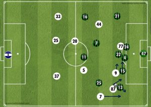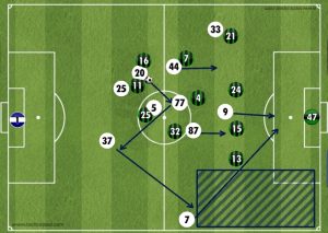 A prime example of Cancelo being utilised was in the 17th minute after a great attack by the Nerazzurri which came so close to opening the scoring. It all started down the left side to drag players over creating space on the far side and Sassuolo packed out the middle allowing Inter to play it out wide however João made the most of it as he positioned himself perfectly to receive a pass, pick his head up to find an option and attack; his cross was almost inch perfect, a let off for Iachini’s men.