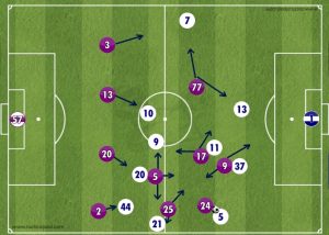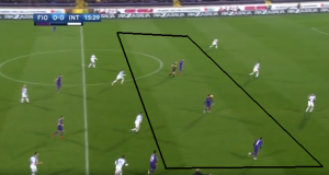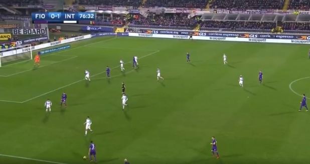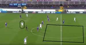 Inter’s wide men dropped deeper to make a flat 4 man midfield from the 75th minute onwards to cover potential spaces for the very attacking at this point Fiorentina.