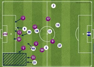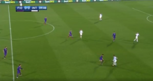 Fiorentina continued to be the team in control of this game, with and without the ball and one of the factors towards that was the front three being able to find space between the lines, allowing them to directly attack the defence and make runs in behind to drag players away to create space or play a ball. If the right decisions were made, Inter could’ve been one or two goals down at least.