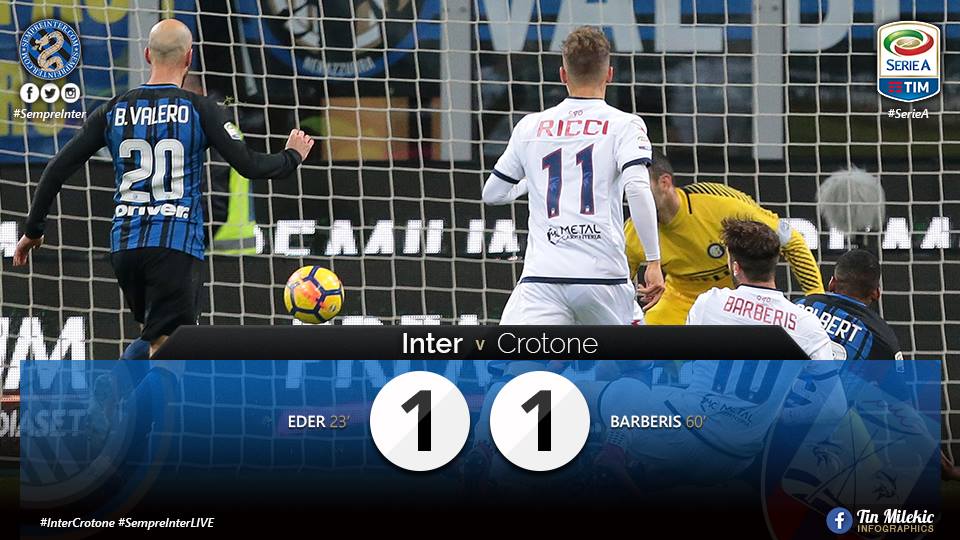 Despite Italian international striker Eder giving the Nerazzurri the lead midway through the first half, the Nerazzurri were unable to secure the three points after Crotone equalized in the second half.