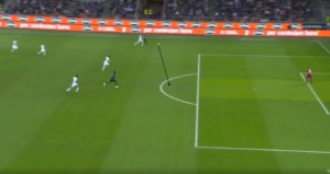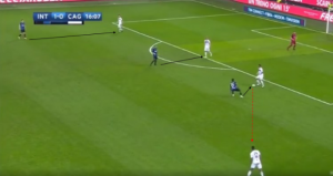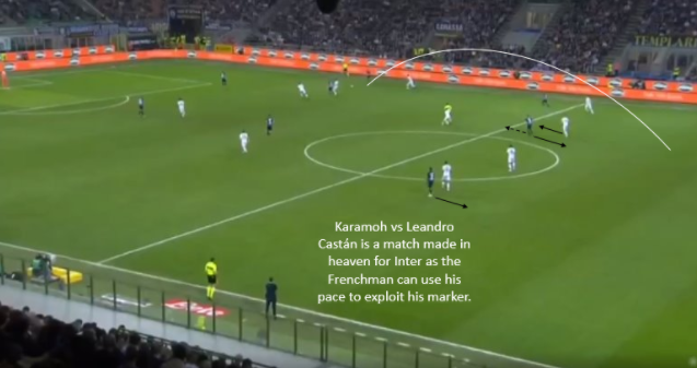 As you can see, there is a massive gap from the defence to the players pressing and with minimal movement, Inter managed to create a clear-cut chance from this position with just two passes. Mauro Icardi fools his marker by making a small run towards the ball thus dragging him out and creating more space in behind for the long ball. As soon as that ball is played, Karamoh knows to make his move as he has the pace advantage on his marker also.