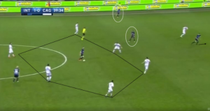 The Nerazzurri’s front three pressed the three defenders of Cagliari cutting off passing lanes out wide, forcing the ball through the middle where Inter had three players ready to pounce.