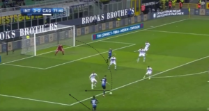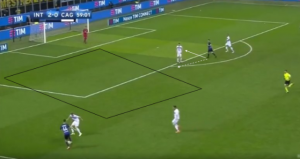 From the above image, Romagna is completely useless in this situation since Ivan can have a shot at goal or find Karamoh with a pass creating a great chance however if the defender received some help from those in front of him or the midfielder to his left, it would be a lot harder for Inter to find gaps to expose. This was a common theme from the very start of the match and it was a major downfall for Cagliari who simply put in one of the worst performances I have seen from a team in Serie A this season.