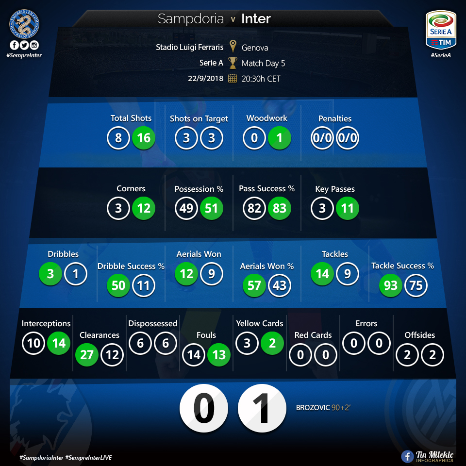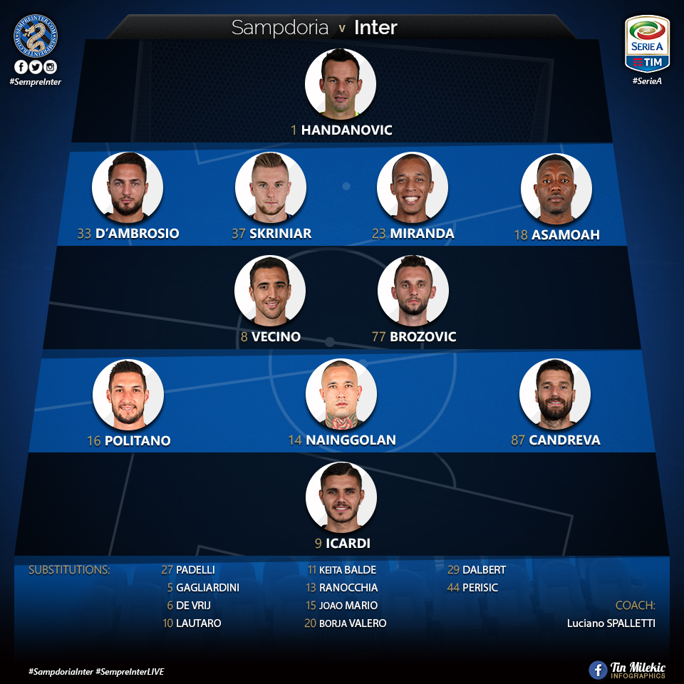 Inter played Sampdoria away from home in what started off as probably as a very slow game on Inters behalf. The back line was reintroduced to D’Ambrosio who returned from injury, as well as Miranda who took De Vrij’s spot next to Skriniar. The holding midfielders were Brozovic and Vecino and in front of them was Candreva on the left Radja in that number 10 role and Politano on the right with Icardi on top.