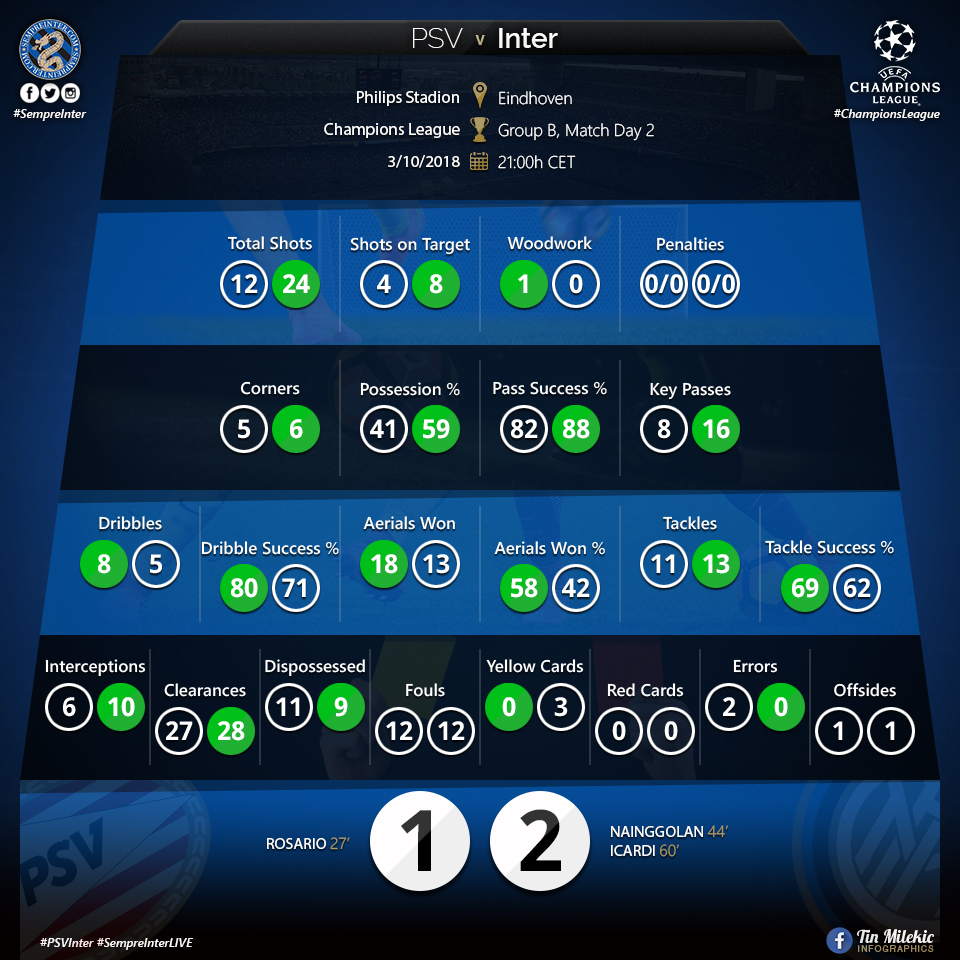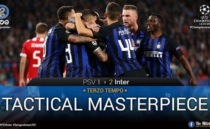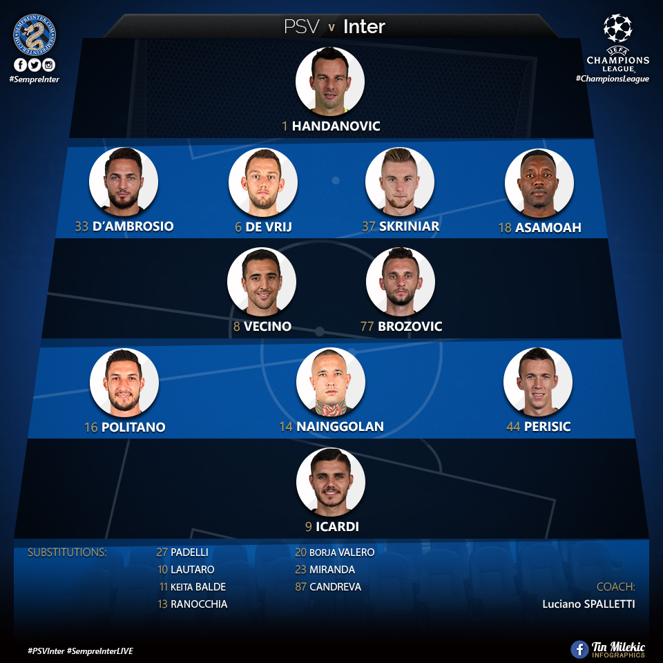 Inter played PSV away from home in what was probably one of the juiciest games in regards to how much tactical preparations were put into playing this game. Spalletti opted to line up with his most reliable eleven. Handanovic in nets who played an absolutely phenomenal game, the standard back line but in a much more aggressive manner on the outsides and very heavy supporting play from the usual midfield with Icardi on top bothering the center backs.