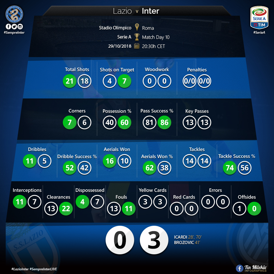Together with Vecino, whose lungs must be made of steel given that he doesn’t seem to know what fatigue is but only knows how to run run and then run some more, Joao Marioa and Brozovic gave an epic midfield masterclass against a Lazio who is hardly in shortage of midfield class.