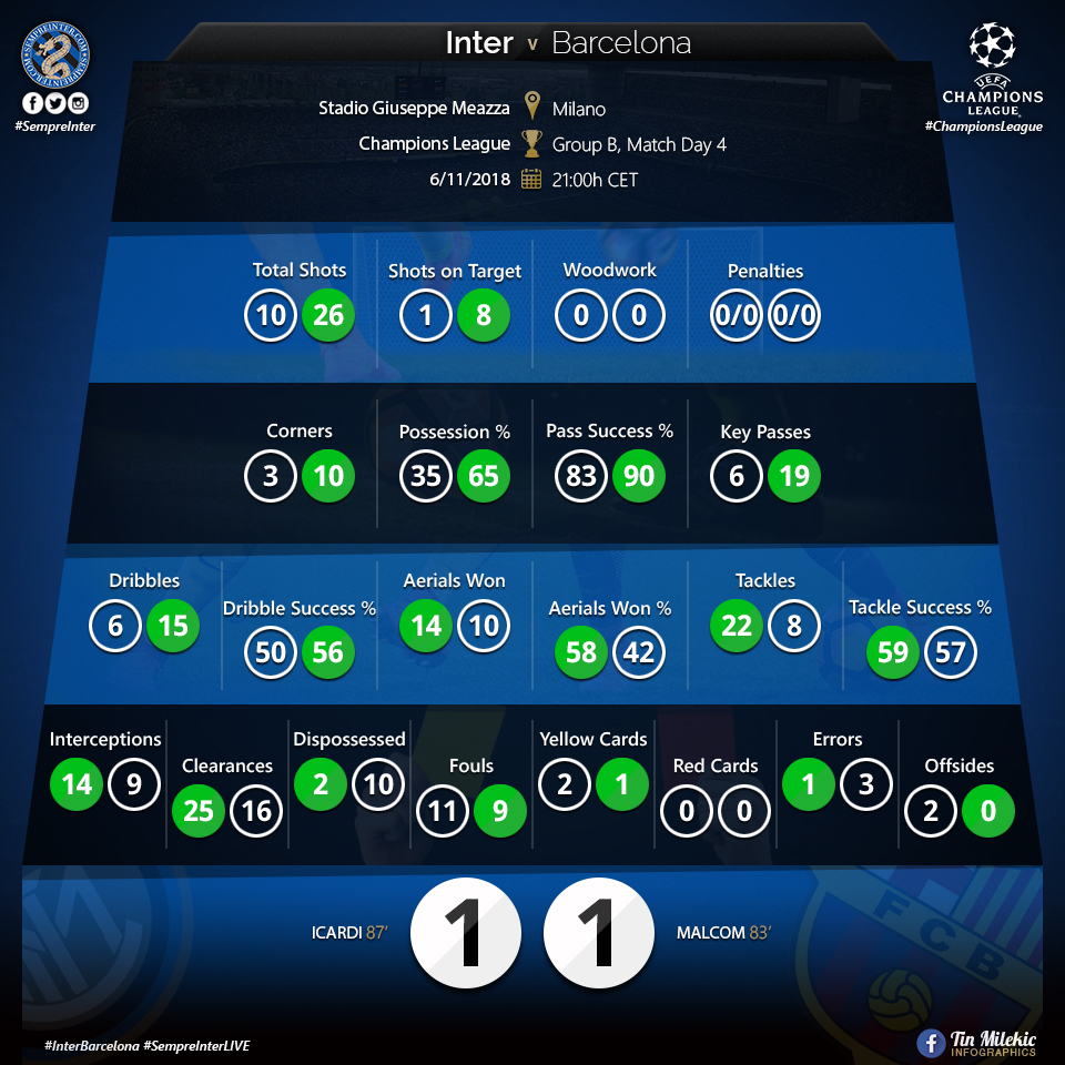 Inter played Barcelona at home in a game that basically would have pushed the winning team into a spot in the knockout round of the Champions League but instead ended in a 1-1 draw with neither team booking their place in the second round, at least not on the night.
