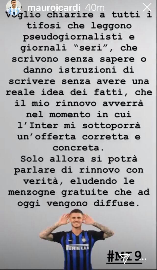 Inter captain Mauro Icardi continued making his position clear via his official Instagram account, this time regarding the ongoing negotiations or lack thereof, concerning a new contract with the Nerazzurri.