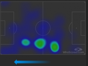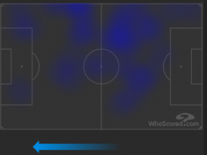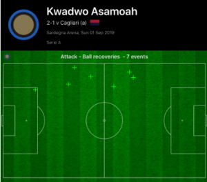 The goal came from link up play with Asamoah, and this was a theme throughout the match. As shown by the heat map above, Sensi was able to create 2 v 1’s down the left side and supply Asamoah high up the pitch. He also chose when to play the ball at pace very well, with a number of effective quick passing moves to disrupt the compact Cagliari back line and bring them out of position. The main attacking threat from the midfield three, he completed the most passes in the final third of any player on the pitch (21/28).