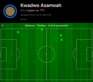 This tactic that Conte is choosing to pursue is currently bringing out the best in Asamoah, and this was shown by his impressive stats. He completed the most take-ons of anyone on the pitch (7/8), with no one else from Inter completing more than 2 (and this was surprisingly Diego Godin).