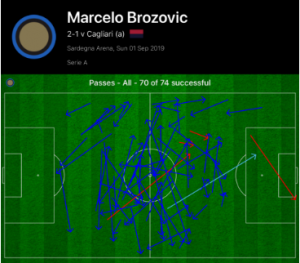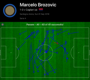 Following the Cagliari equalizer, he once again helped Inter regain control of the match, and ended the game with 70 passes completed out of 74.