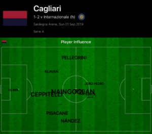 Kwadwo Asamoah was influential once again for Inter, providing the main outlet out wide, with Brozovic and Sensi key to this link. As shown by the influence map below, Asamoah played very high on the left wing alongside Sensi, and this subsequently forced Nandez back for Cagliari and restricted his threat as an attacker.