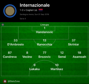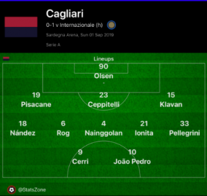 Cagliari made a number of changes following their 1-0 defeat at home to Brescia on the opening day, including new signings Robin Olsen in goal, Luca Pellegrini at wing back and Marko Rog in midfield. Rolando Maran also opted for a change in system from the defeat to Brescia, choosing to match Inter’s 3-5-2.