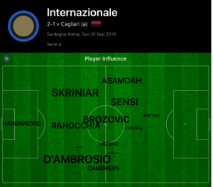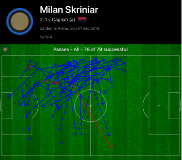 The other performance of note for Inter was Milan Skriniar, who was solid defensively, as well showcasing his ability to play out from the back. He completed the most passes of any player on the pitch (below), and was fundamental in providing a link to Sensi and Brozovic. His passing ability is key to how Conte is looking to play this season, particularly from the back, and coupled with Godin at the back, expect to see a solid Inter backline this season.