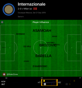 Barella, Brozovic and Sensi pressed well, shown by their high positioning below, whilst the back three employed a very high line looking to condense the play, and as a result Milan didn’t manage a shot in the first twenty minutes of the second half, whereas Inter created six.