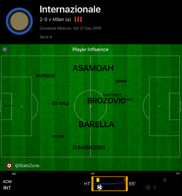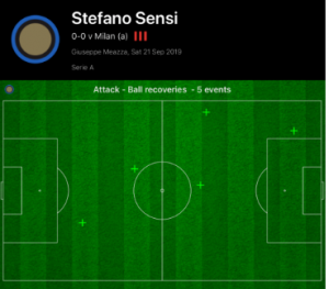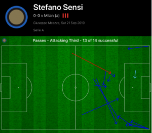 This subsequently allowed Sensi the freedom to push on and have an influence further forward, allowing him to top the chances created in the first half for Inter with two, whilst he also led the press high up when they lost the ball, recovering the ball three times in the opposition half.
