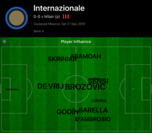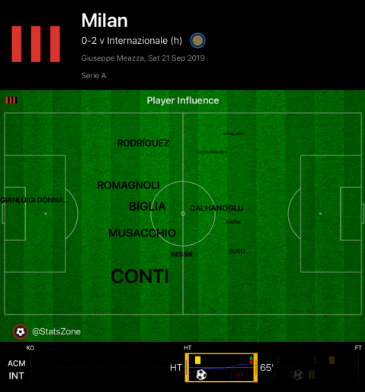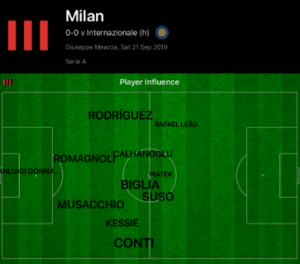 D’Ambrosio was the key outlet throughout the first half for Inter out wide, whereas in previous games attacks had been focussed down Asamoah on the left. This was due to the positioning of Milan’s attackers, and as demonstrated by the influence maps below, Rodriguez was left isolated by the positioning of Rafael Leao up the pitch.