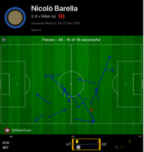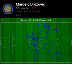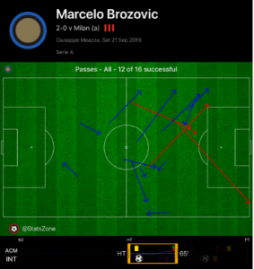 In a cagey opening half, Brozovic impressed once again in midfield for Inter, retaining the ball and linking defence to midfield well. Completing 36 passes, he also contributed defensively, covering the space in front of the back three. As shown below, Brozovic played a lot of forward and sideways passes, which was fundamental to finding space on Milan’s flanks, who had set up very narrow defensively in their 4-3-2-1 formation.