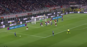The second half got off to a dream start for Conte’s men, as Brozovic fired Inter into the lead three minutes after the break. Although the free kick was well worked, it was aided by the poor defending of Milan, who set up very deep allowing Brozovic plenty of time and space on the edge of the box, as seen below.