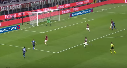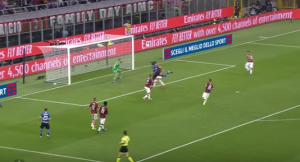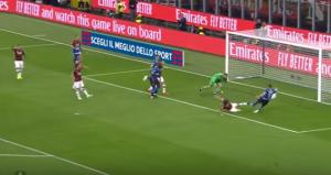 The second Inter goal came as a result of an attack down the left once again, as Milan had pushed on and left Conti isolated at the back. Conte has also switched to a 5-4-1, with Barella moving out to the wide left position, and this was key to the second goal. As shown below, Inter created a 2v1 with Asamoah getting beyond Barella, allowing him space to cross