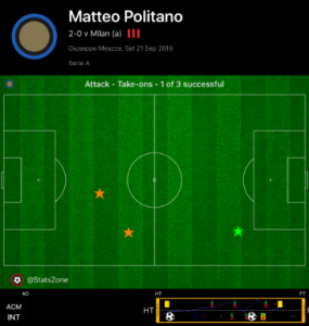 Politano also added the ability to take players on at pace and stretch the game, offering an outlet to stretch the game. Although only completing one take-on in the time he was on, it was indicative of his willingness to run at defenders, and his ability to stretch Milan’s tiring midfield and defence.