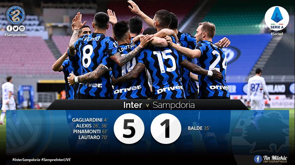 Inter demolished Sampdoria 5-1 in Match Day 35 of the Serie A at the Stadio Giuseppe Meazza in Milano’s San Siro district.