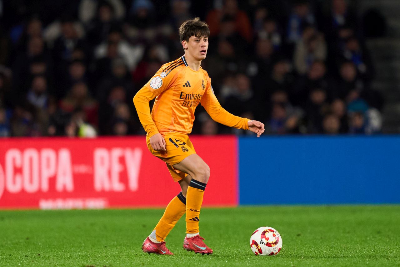 SAN SEBASTIAN, SPAIN – FEBRUARY 26: Arda Guler of Real Madrid in action during the Copa del Rey Semi Final match between Real Sociedad and Real Madrid at Reale Arena on February 26, 2025 in San Sebastian, Spain. (Photo by Juan Manuel Serrano Arce/Getty Images)