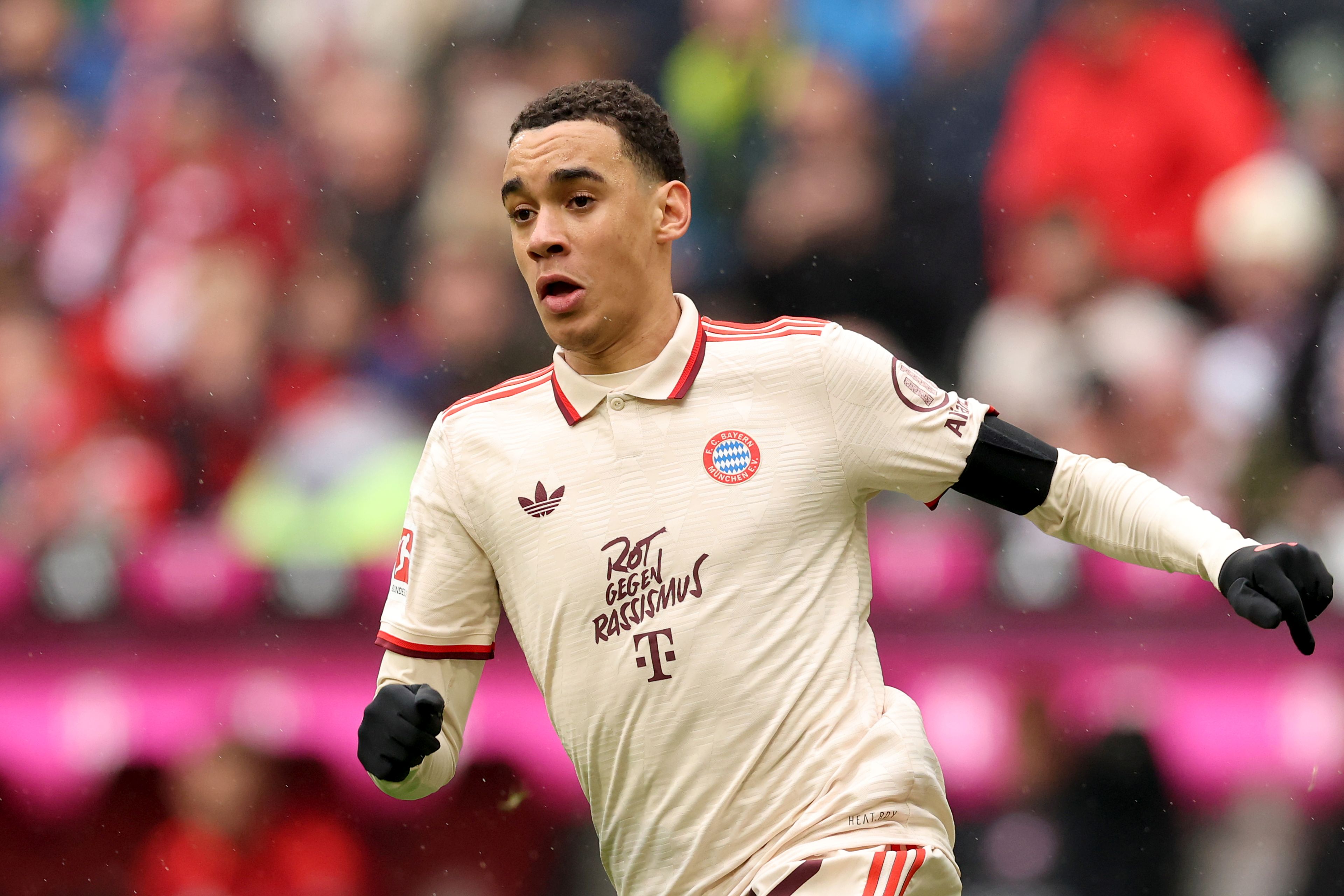 MUNICH, GERMANY – MARCH 29: Jamal Musiala of FC Bayern München runs during the Bundesliga match between FC Bayern München and FC St. Pauli 1910 at Allianz Arena on March 29, 2025 in Munich, Germany. (Photo by Alexander Hassenstein/Getty Images)
